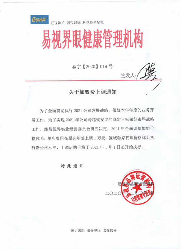 2020年度易視界加盟費(fèi)上調(diào)通知